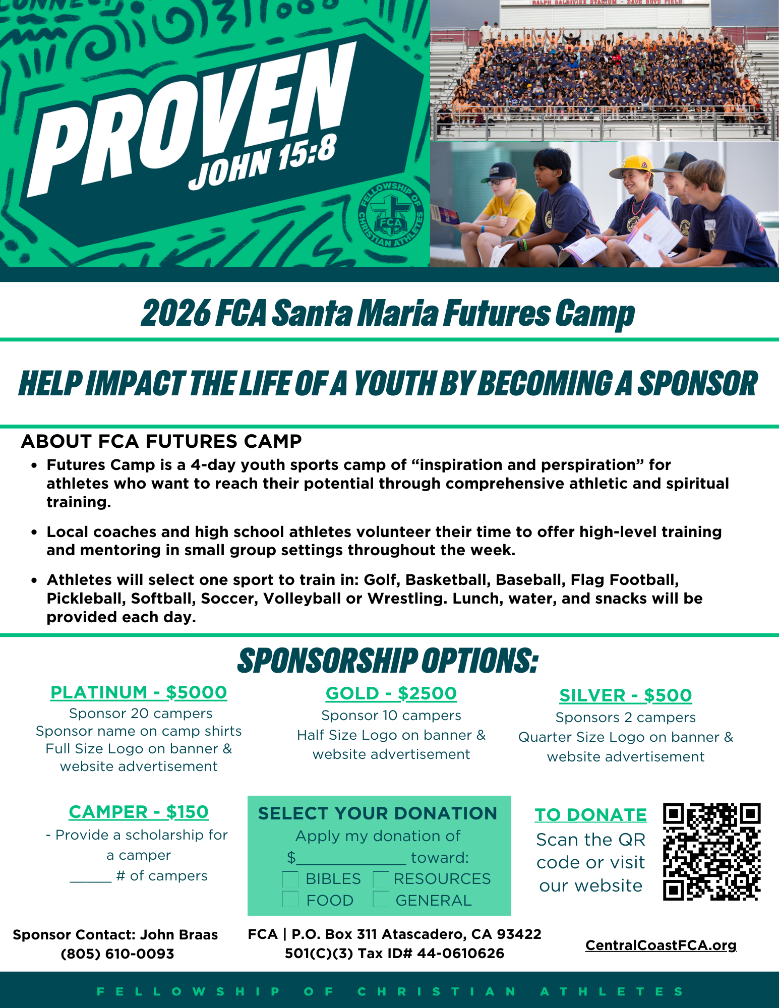 - North County Camp: Maria Roberts, mariaroberts@fca.org, (805) 215-0553